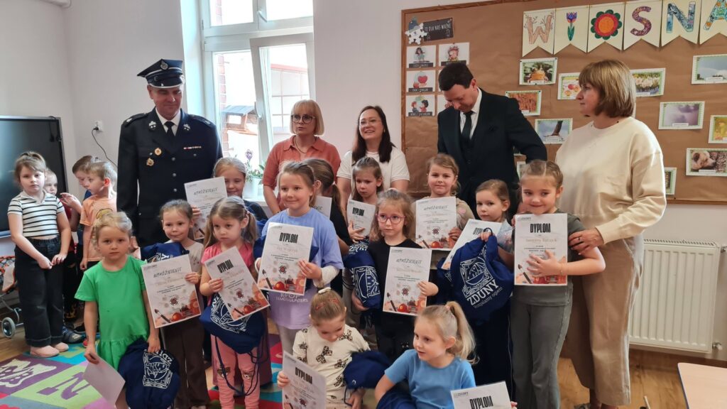 od wielu lat cieszy się dużym zainteresowaniem. Konkurs ten nie tylko rozwija kreatywność najmłodszych, ale także pozwala im wyrazić podziw i szacunek dla pracy strażaków, którzy są dla nich prawdziwymi bohaterami. Dzieci z ogromnym zaangażowaniem przygotowują swoje prace, wykazując się pomysłowością i wrażliwością na tematykę bezpieczeństwa oraz niesienia pomocy innym. Ich twórczość pokazuje, jak ważną rolę w ich świadomości odgrywa zawód strażaka. Wszystkie uczestniczące dzieci zostały docenione – otrzymały prezenty oraz dyplomy, które wręczyli Burmistrz Zdun Miłosz Zwierzyk oraz Prezes Zarządu Oddziału M-G OSP RP w Zdunach Grzegorz Grobelny. To wyjątkowe wyróżnienie było dla najmłodszych ogromną radością i motywacją do dalszego rozwijania swoich talentów. Ale to nie koniec informacji w tym temacie. Kilka prac zakwalifikowało się z etapu gminnego i będą reprezentować nasze przedszkole na kolejnych etapach.