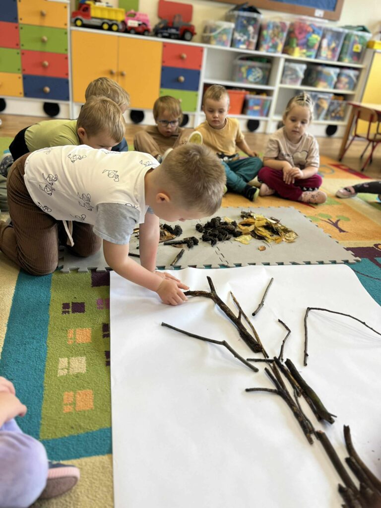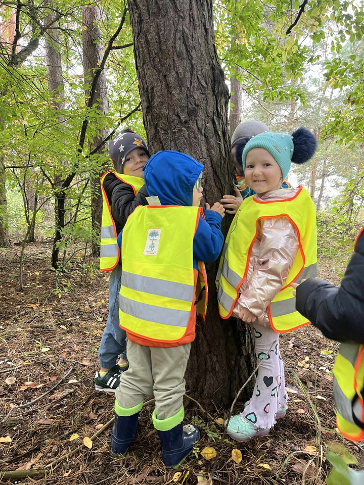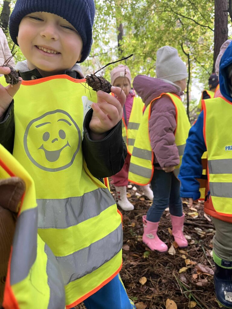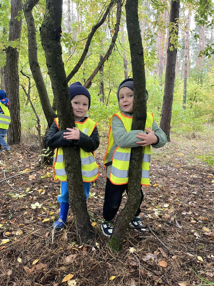 Grupa „Lisków” wybrała się na jesienny spacer do lasu, którego celem było poznawanie przyrody wszystkimi zmysłami. Dzieci obserwowały drzewa, liście, szyszki oraz szukały oznak jesieni. Po powrocie do sali przedszkolaki stworzyły własne drzewo z przyniesionych darów lasu, rozwijając swoją wyobraźnię i kreatywność.