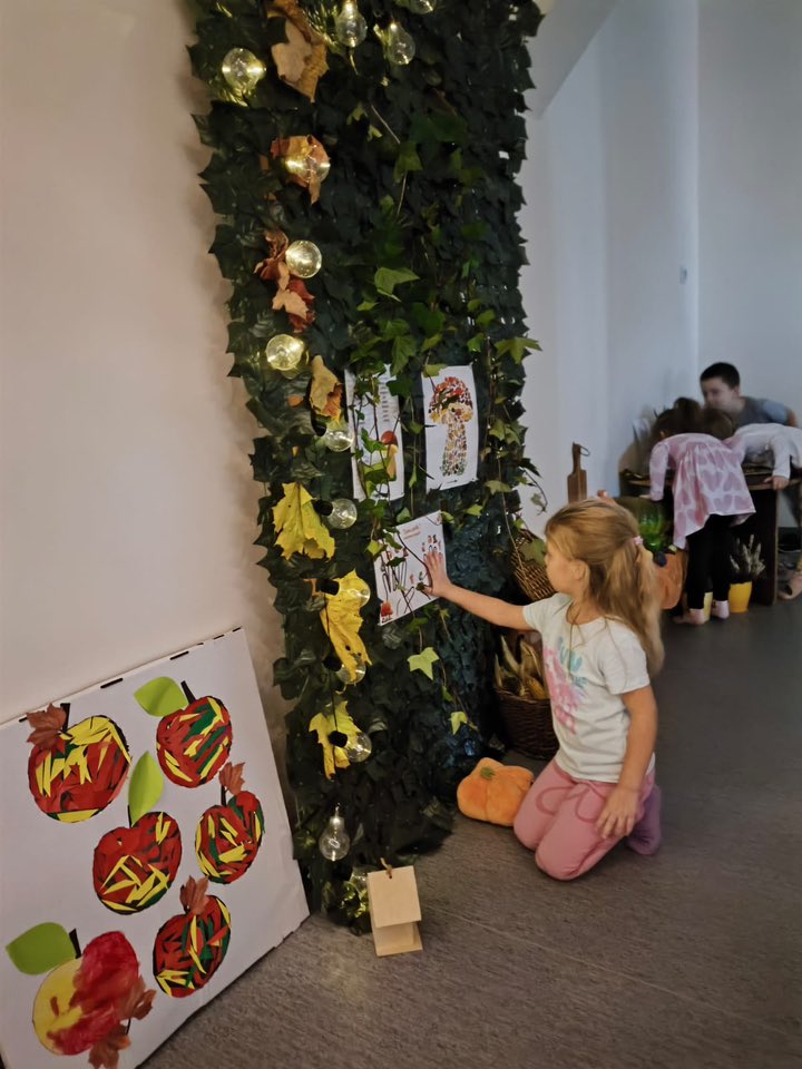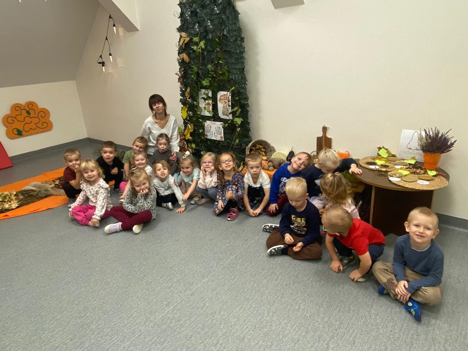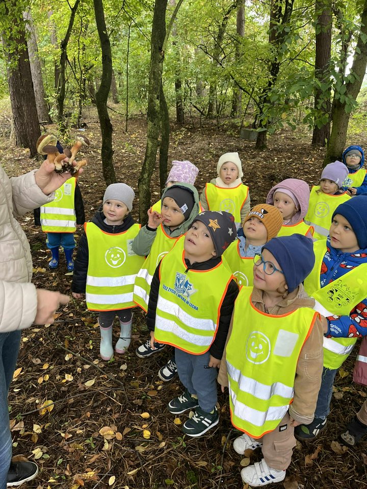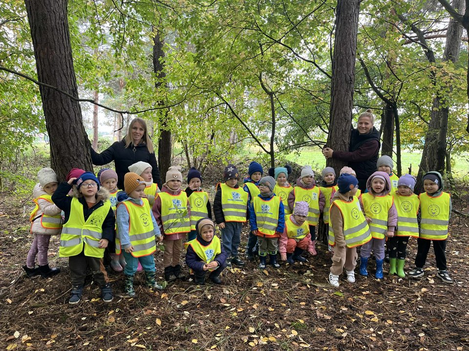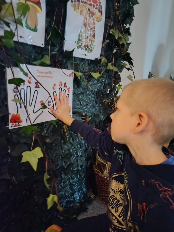 Grupa „Lisków” wybrała się na jesienny spacer do lasu, którego celem było poznawanie przyrody wszystkimi zmysłami. Dzieci obserwowały drzewa, liście, szyszki oraz szukały oznak jesieni. Po powrocie do sali przedszkolaki stworzyły własne drzewo z przyniesionych darów lasu, rozwijając swoją wyobraźnię i kreatywność.