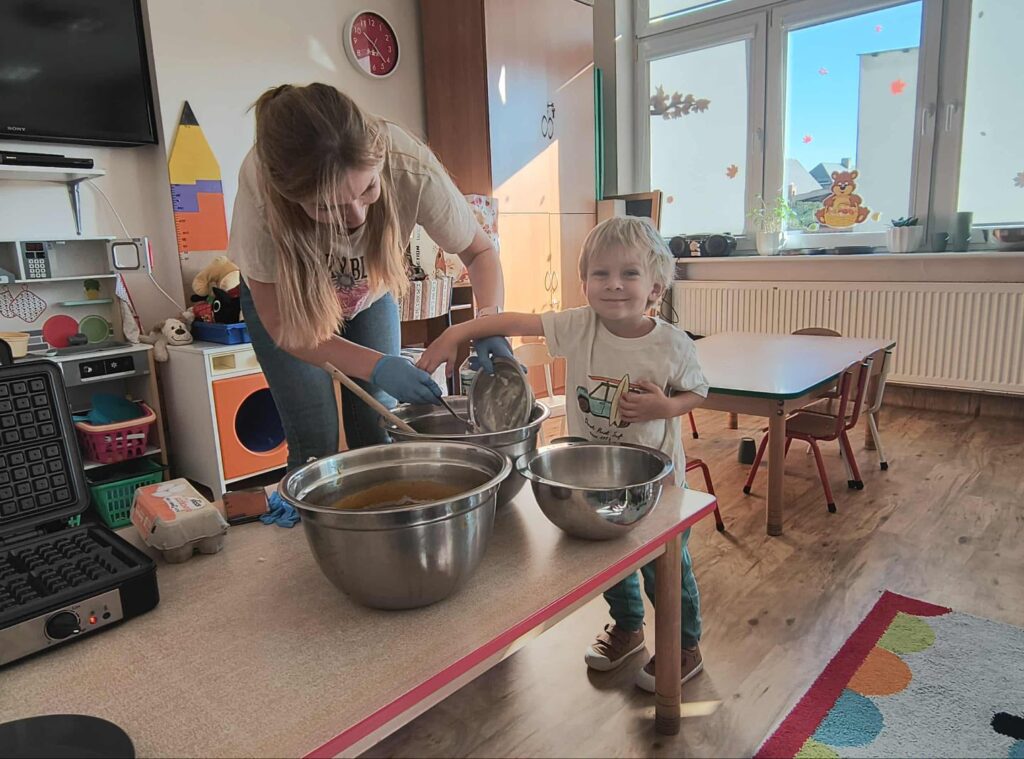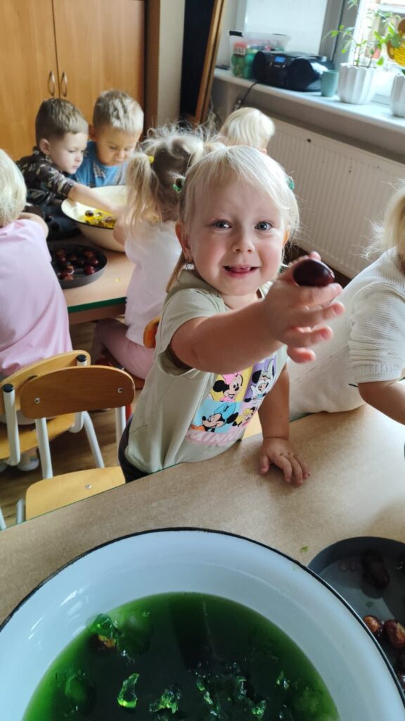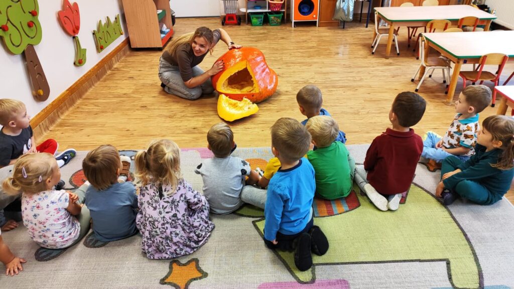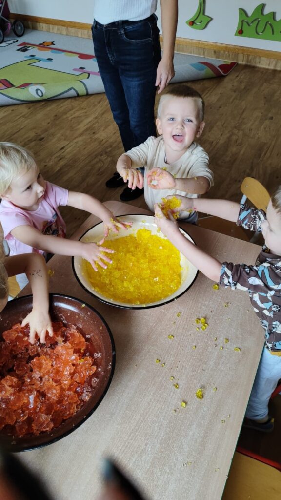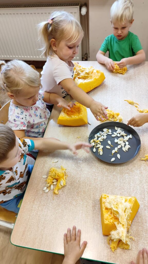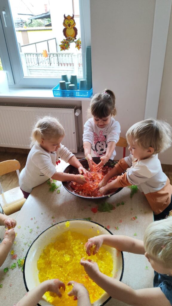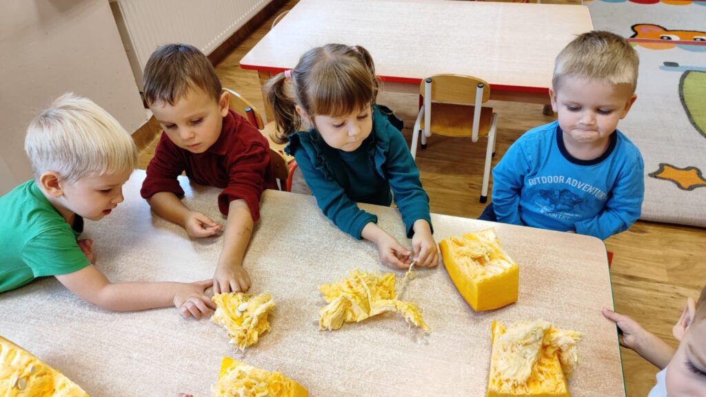 Przez ostatnie kilka dni Żabki odkrywały jesień za pomocą różnych zmysłów. Dzieci brały udział w zabawach sensorycznych, które pozwoliły im doświadczać barw, zapachów, faktur i smaków tej pory roku. Maluszki w swojej sali utworzyły ścieżkę sensoryczną z darów jesieni. Dzieci chodziły na boso po kasztanach, żołędziach, liściach, orzechach i gałązkach. W ten sposób mogły poczuć pod stopami różne struktury i temperatury. Przedszkolaki bawiły się także w poszukiwanie kasztanów zatopionych w galaretce w jesiennych kolorach. Dzieci mieszały, dotykały i obserwowały, jak zmienia się konsystencja galaretki, rozwijając przy tym zmysł dotyku, wzroku i węchu. Kolejną zabawą było poznawanie dyni – maluszki wyciągały z niej pestki, oglądały miąższ i wąchały charakterystyczny zapach warzywa. Na zakończenie dzieci samodzielnie przygotowały pyszne i zdrowe dyniowe gofry, które później wspólnie degustowały. Dzieci z zaangażowaniem odkrywały świat jesieni, rozwijając przy tym swoje zmysły, ciekawość poznawczą oraz samodzielność.