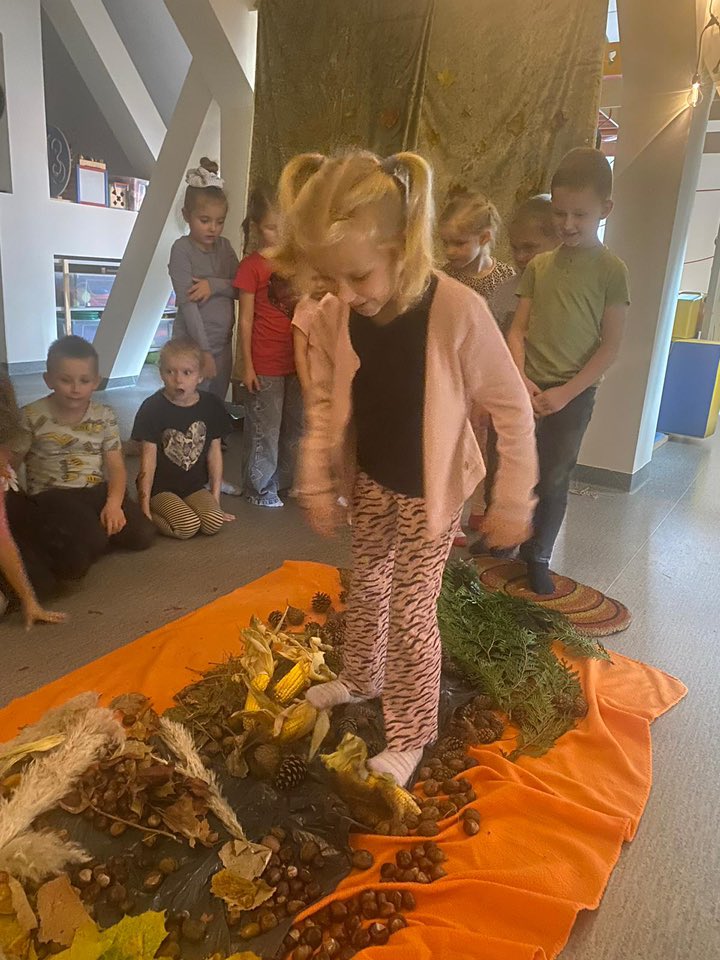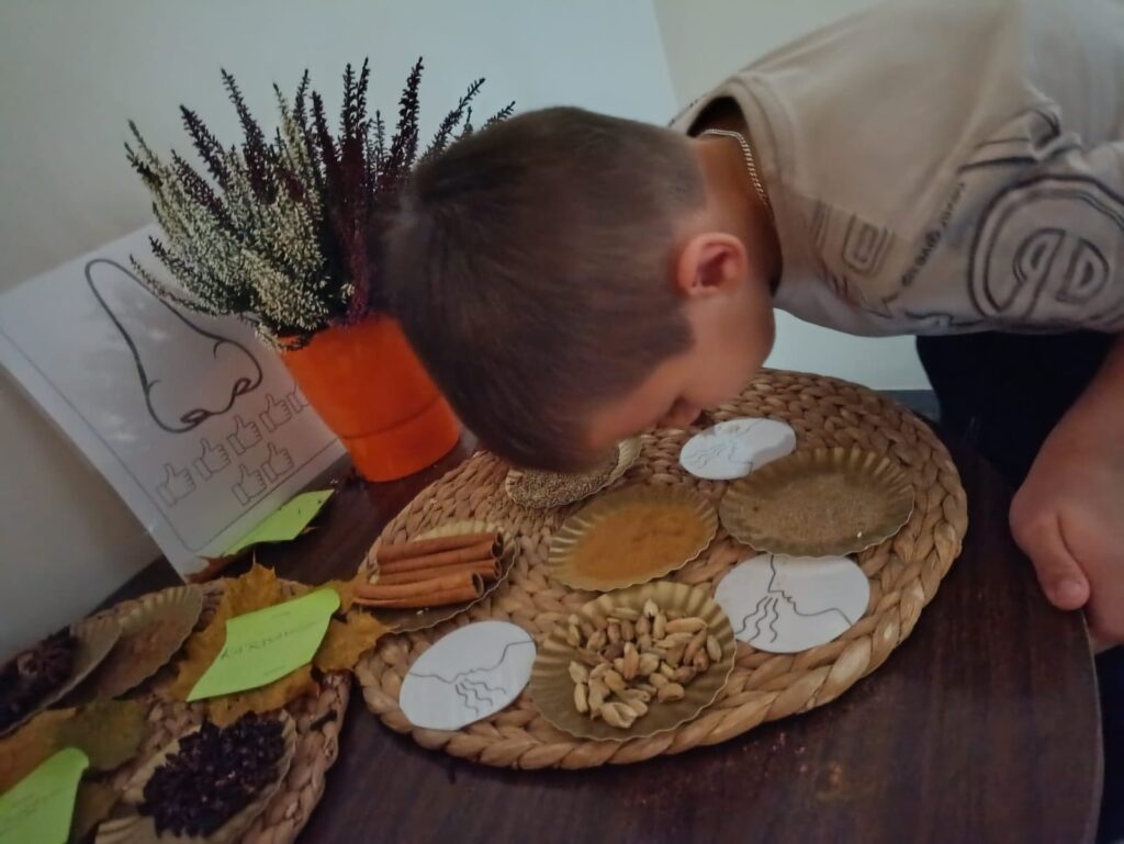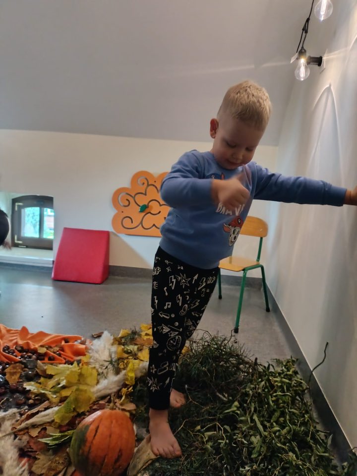 W naszym przedszkolu odbyła się wyjątkowa akcja pod hasłem „Jesienne doznania sensoryczne”, podczas której dzieci mogły odkrywać przyrodę wszystkimi zmysłami. Specjalnie przygotowana salka sensoryczna zamieniła się w prawdziwy leśny zakątek. Na dzieci czekała ścieżka sensoryczna, zbudowana z naturalnych materiałów – szyszek, gałązek, liści, kukurydzy czy kasztanów. Przedszkolaki z radością przemierzały ją boso, poznając różne faktury i odczucia pod stopami. W sali unosił się zapach lasu, a w tle słychać było odgłosy przyrody, które wprowadzały w spokojny, leśny nastrój. Podczas zajęć dzieci miały też okazję poznać zapachy różnych przypraw, takich jak cynamon, goździki, anyż czy gałka muszkatołowa. Wspólne wąchanie i zgadywanie aromatów było nie tylko świetną zabawą, ale też ćwiczeniem zmysłu węchu i sposobem na poznanie świata natury. Cała akcja dostarczyła dzieciom wielu radosnych wrażeń, rozwijała ich ciekawość, spostrzegawczość i wrażliwość sensoryczną.