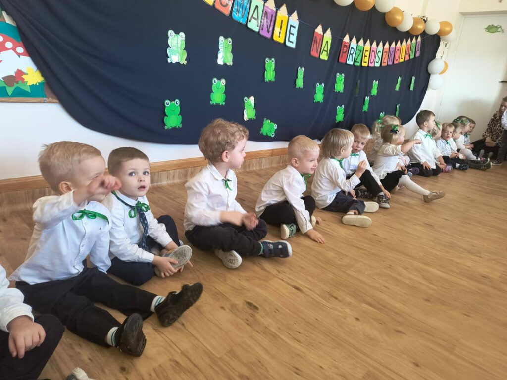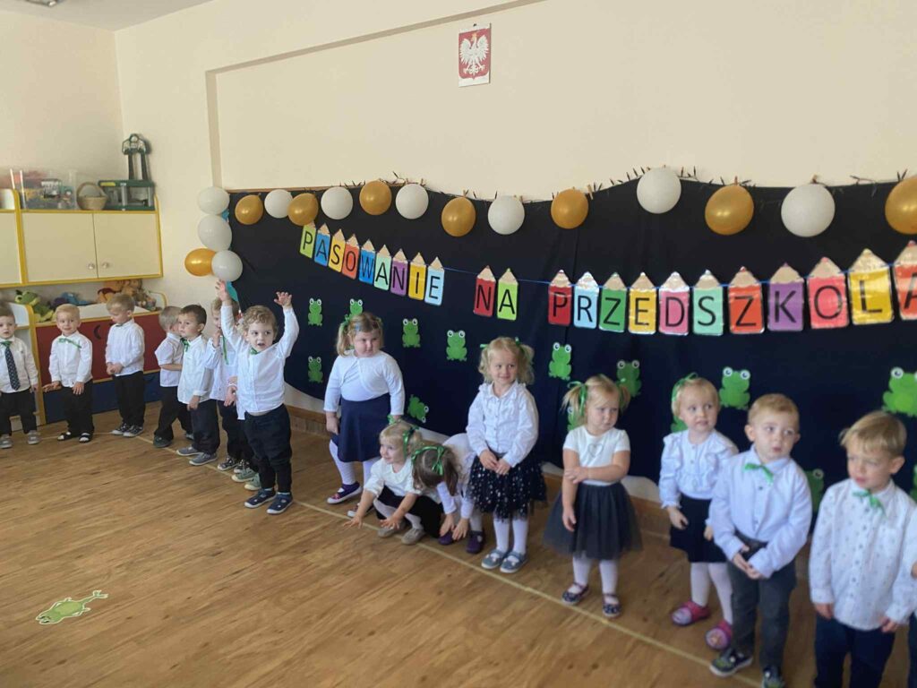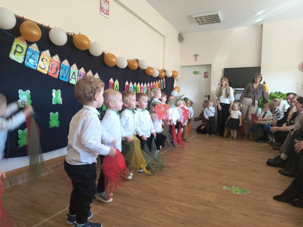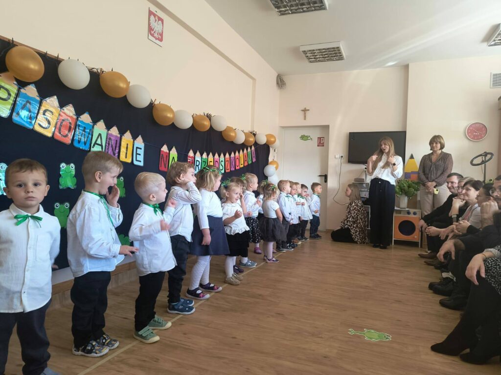 31 października w naszym przedszkolu odbyło się uroczyste pasowanie na przedszkolaka dzieci z grupy Żabki Na tę wyjątkową okazję zostali zaproszeni rodzice oraz pani dyrektor. Maluchy zaprezentowały piękny program artystyczny – z wielkim zaangażowaniem tańczyły, śpiewały piosenki i recytowały wierszyki. Po występie pani dyrektor dokonała symbolicznego aktu pasowania, a każde dziecko otrzymało pamiątkowy dyplom i drobny upominek. To był wyjątkowy, pełen emocji dzień – pierwszy ważny krok naszych Żabek w przedszkolnej przygodzie!