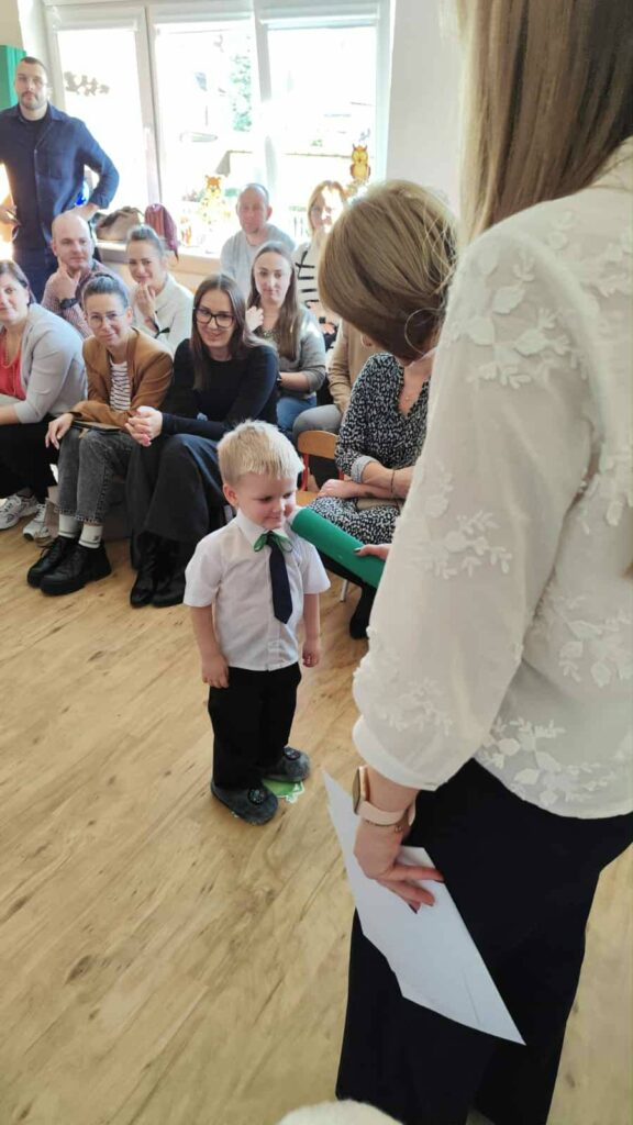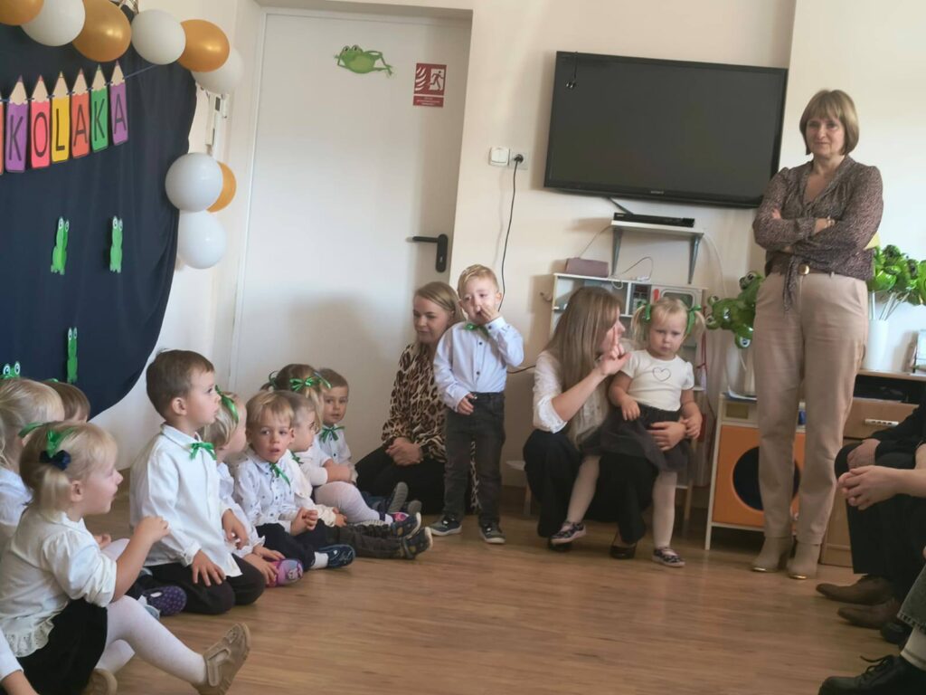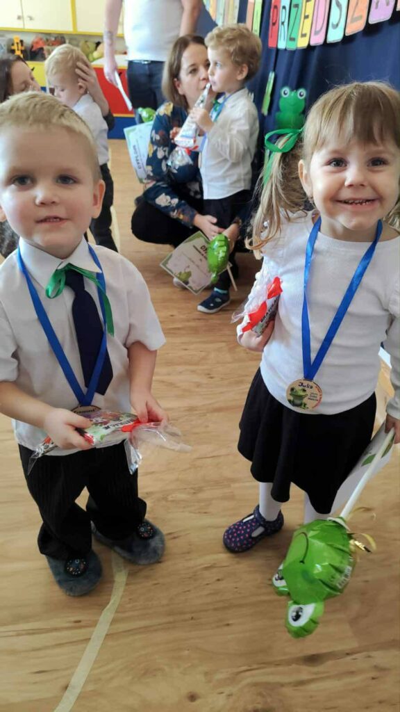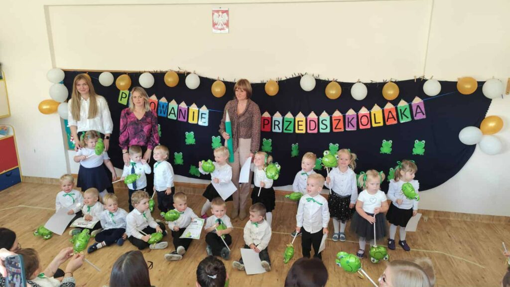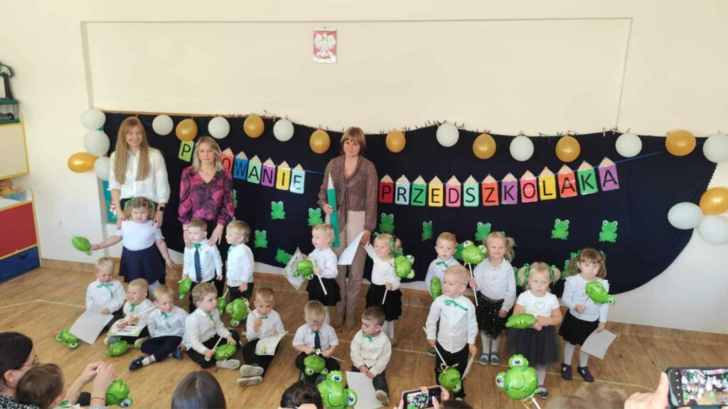 31 października w naszym przedszkolu odbyło się uroczyste pasowanie na przedszkolaka dzieci z grupy Żabki Na tę wyjątkową okazję zostali zaproszeni rodzice oraz pani dyrektor. Maluchy zaprezentowały piękny program artystyczny – z wielkim zaangażowaniem tańczyły, śpiewały piosenki i recytowały wierszyki. Po występie pani dyrektor dokonała symbolicznego aktu pasowania, a każde dziecko otrzymało pamiątkowy dyplom i drobny upominek. To był wyjątkowy, pełen emocji dzień – pierwszy ważny krok naszych Żabek w przedszkolnej przygodzie!
